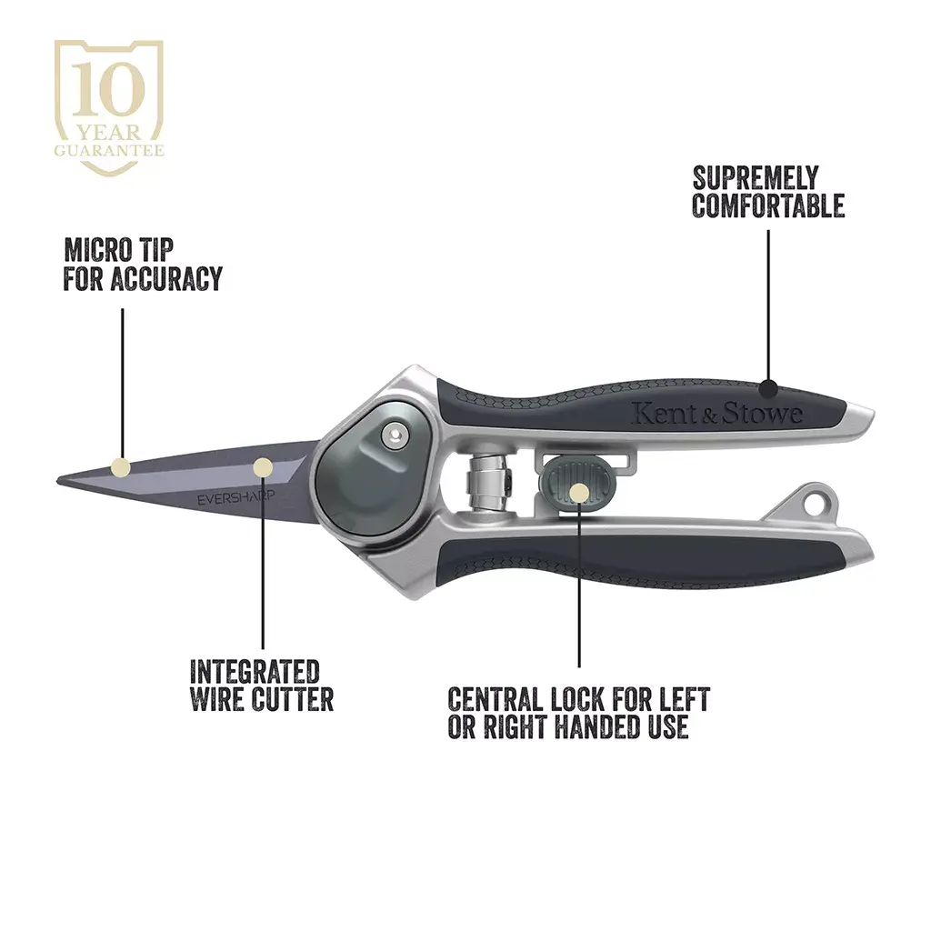These superior snips have a micro tip and precise slice action for accurate trimming around the garden. They feature an integrated wire cutter as well as a central lock for either left or right hand use. Furthermore, they are also supremely comfortable with their aluminium lightweight body and a Bi-material micro hex grip. Use for cutting string and wire, flowers and herbs and even for dead heading.