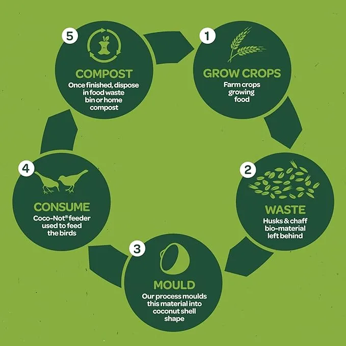 These new, patent pending Gardman Coco-Not Wild Bird Feeders are ready-to-hang suets made of a revolutionary, biodegradable material. Coco-Not feeders, better for nature - not shipped across the world like coconut shells - not using plastic. 100 Percent plant based shell - not there after 12 weeks. 100 Percent compostable.